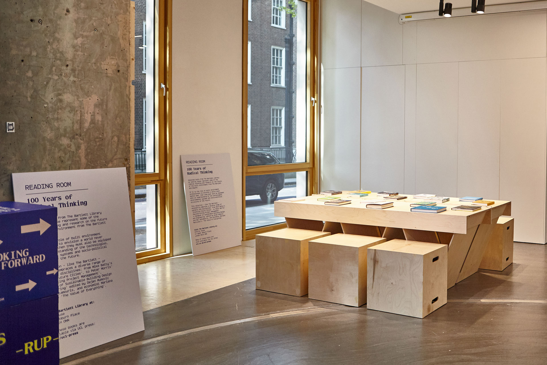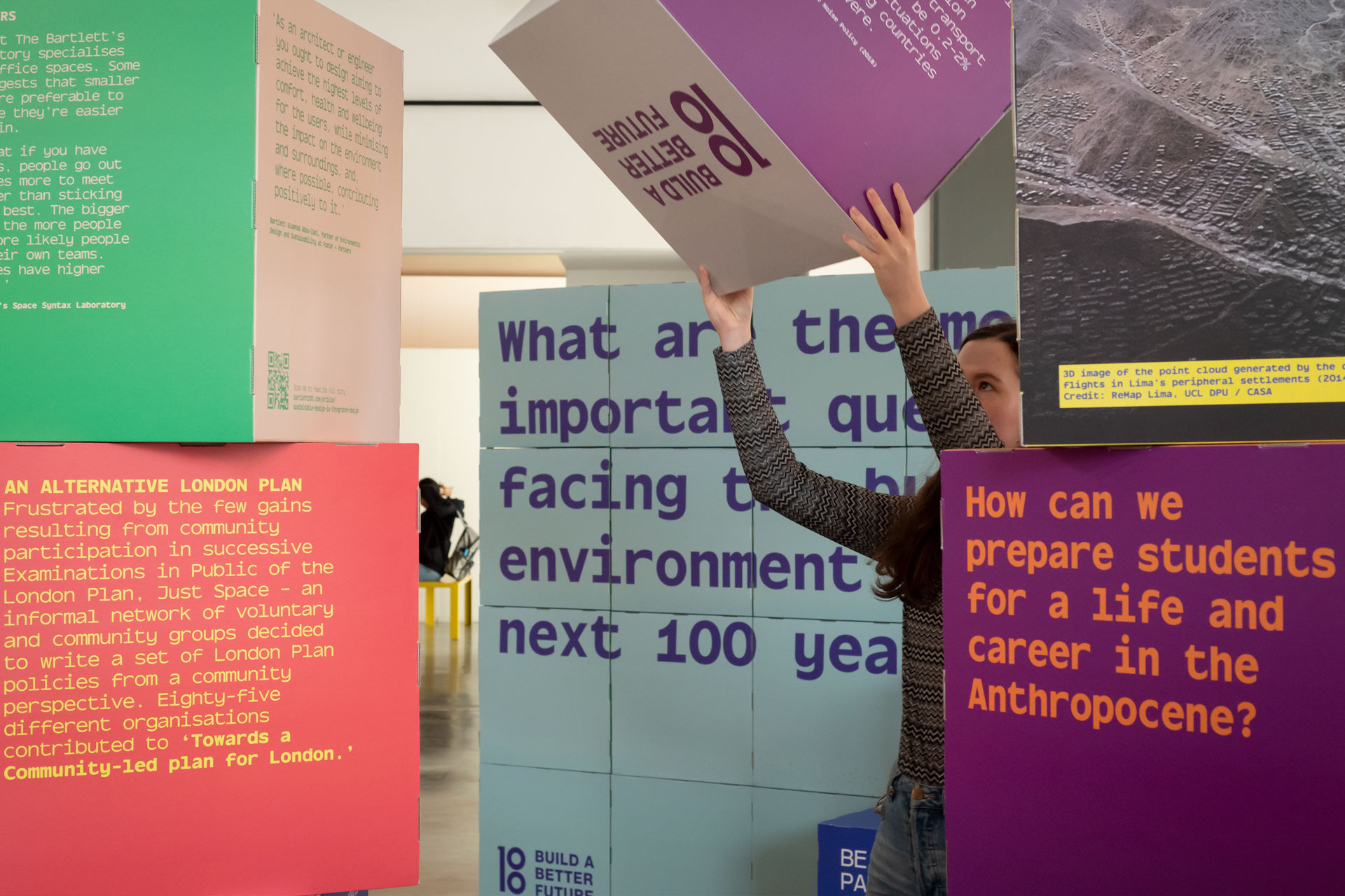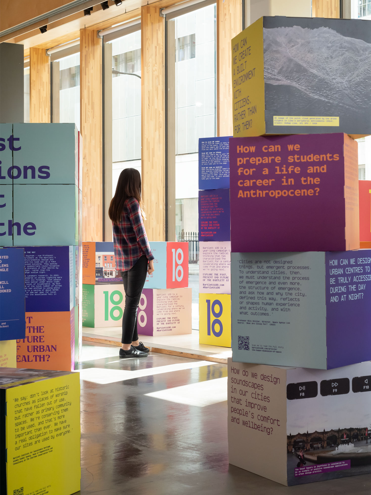 The campaign culminated in an exhibition that looks ahead to the next 100 years. We designed over 100 colourful Corita Kent inspired stacking boxes intended to be explored and read. The boxes posed questions, and were jam-packed with insightful and relevant reading material. With a response wall, and social media feed it’s hoped the exhibition will provide thoughts and input which might help shape a new Manifesto for The Bartlett (and the built environment).