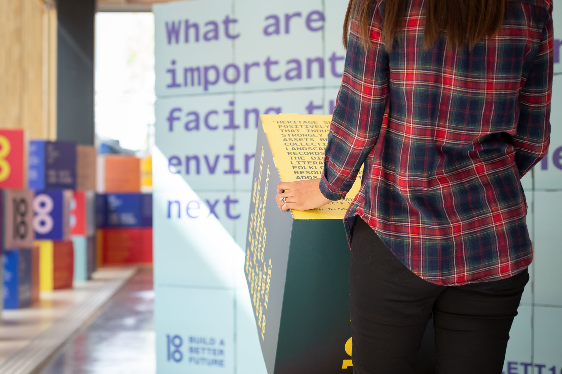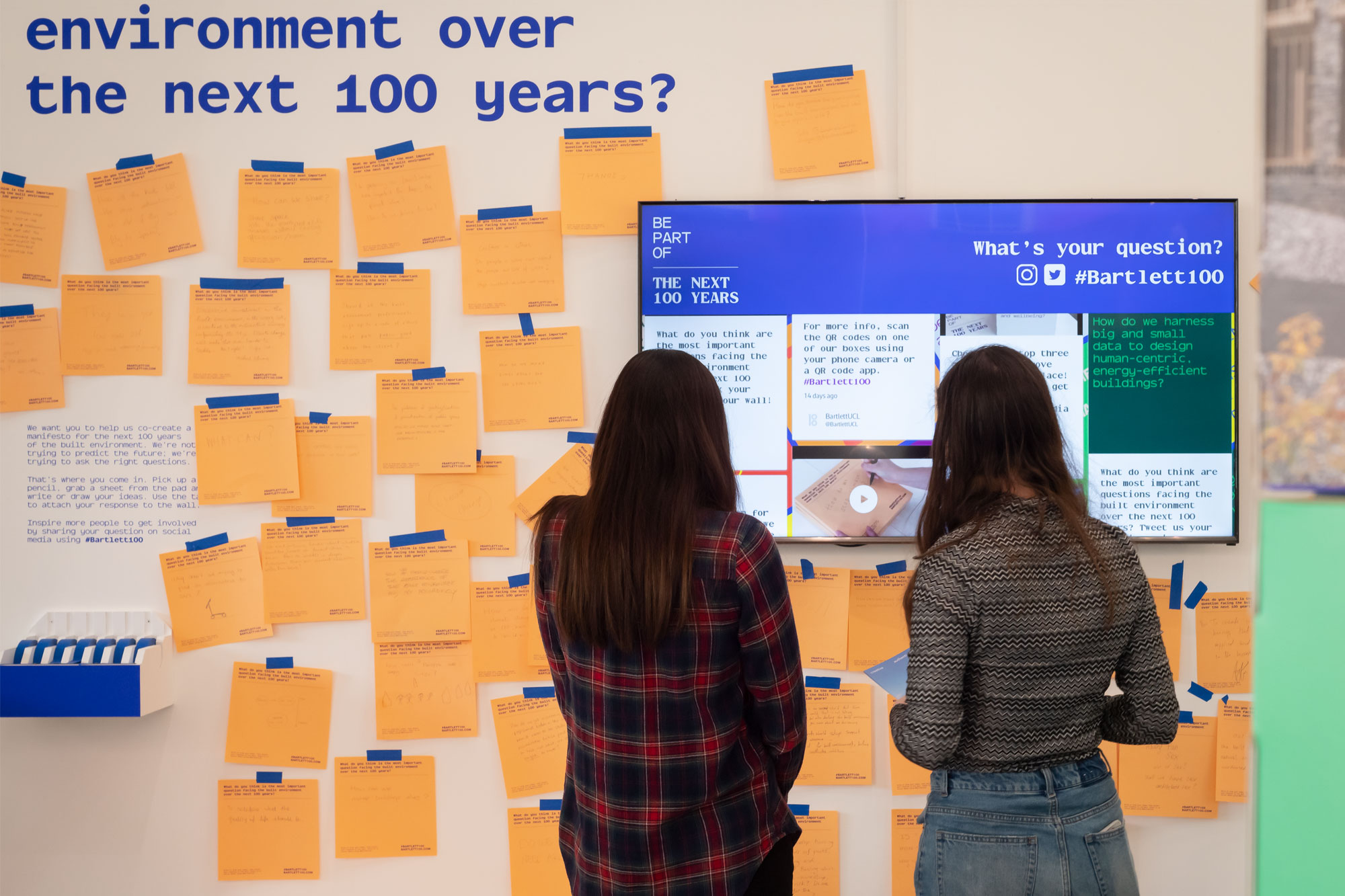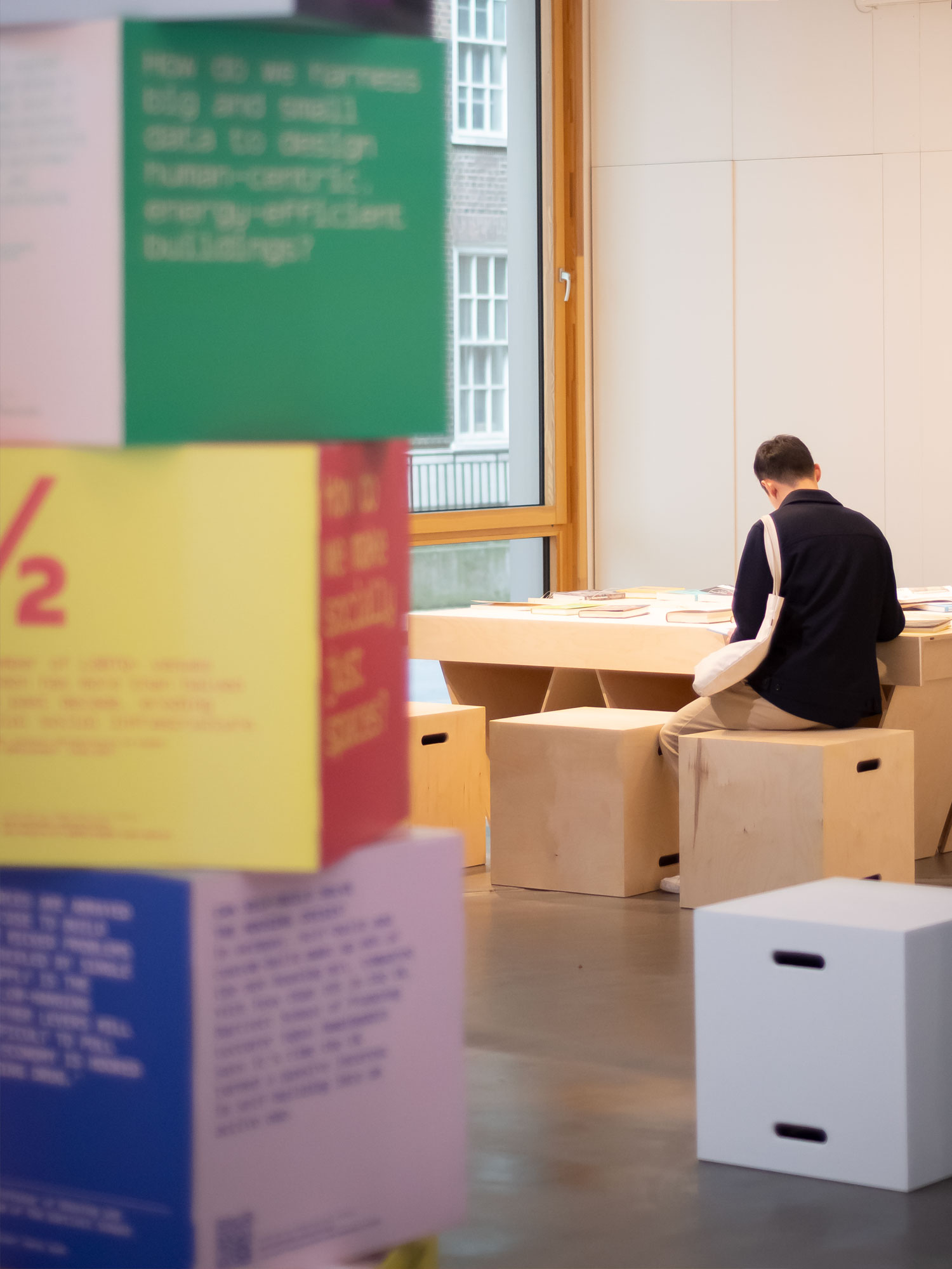 The campaign culminated in an exhibition that looks ahead to the next 100 years. We designed over 100 colourful Corita Kent inspired stacking boxes intended to be explored and read. The boxes posed questions, and were jam-packed with insightful and relevant reading material. With a response wall, and social media feed it’s hoped the exhibition will provide thoughts and input which might help shape a new Manifesto for The Bartlett (and the built environment).