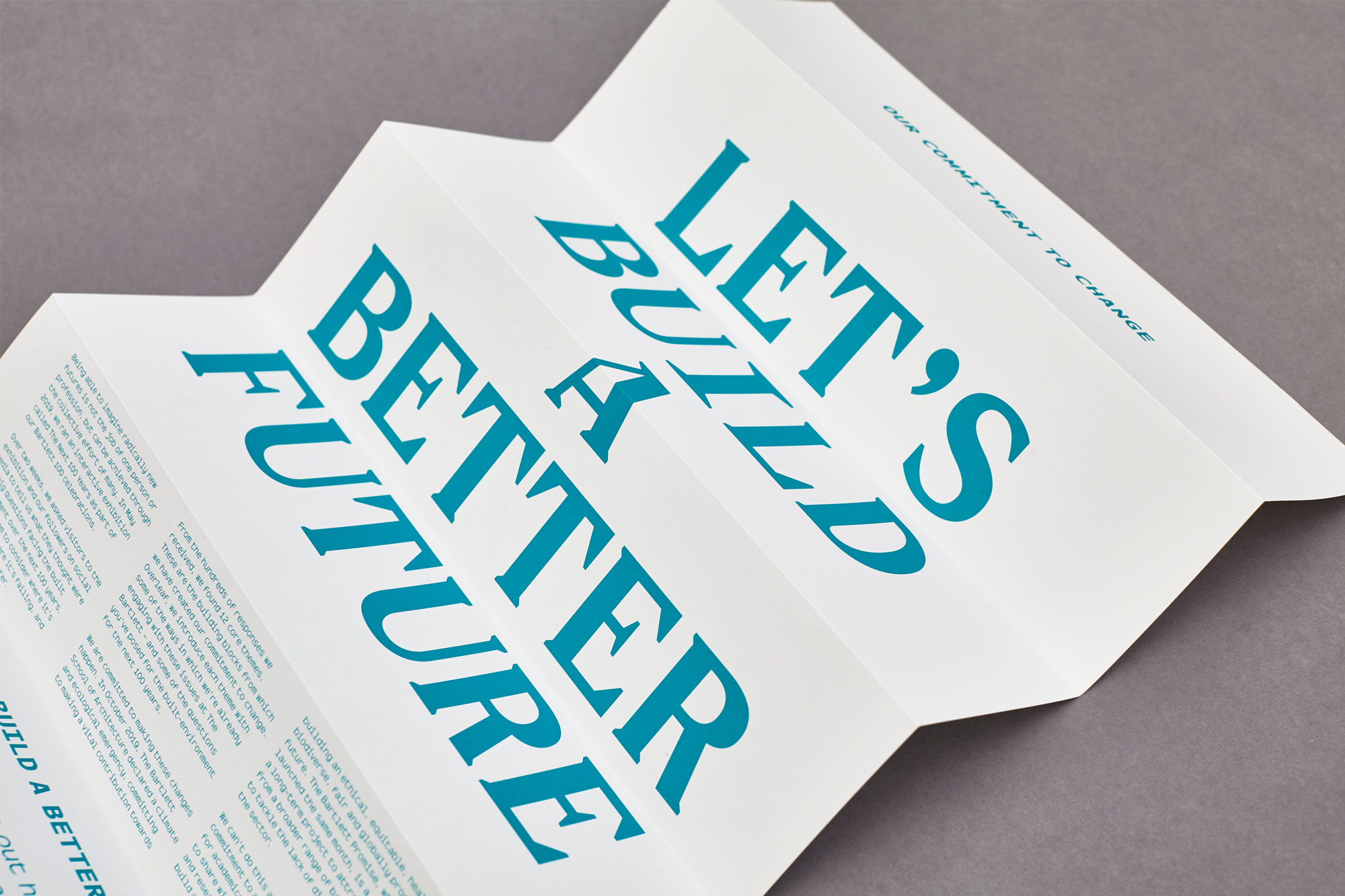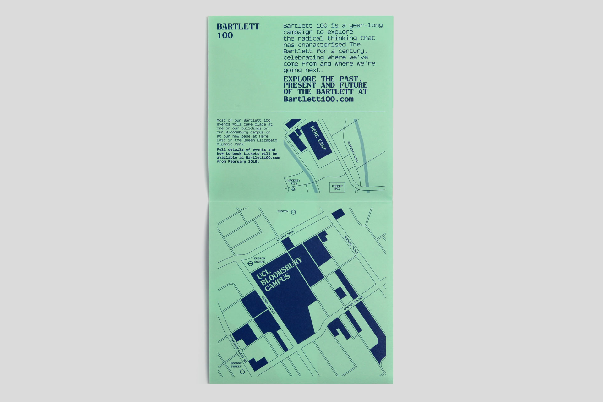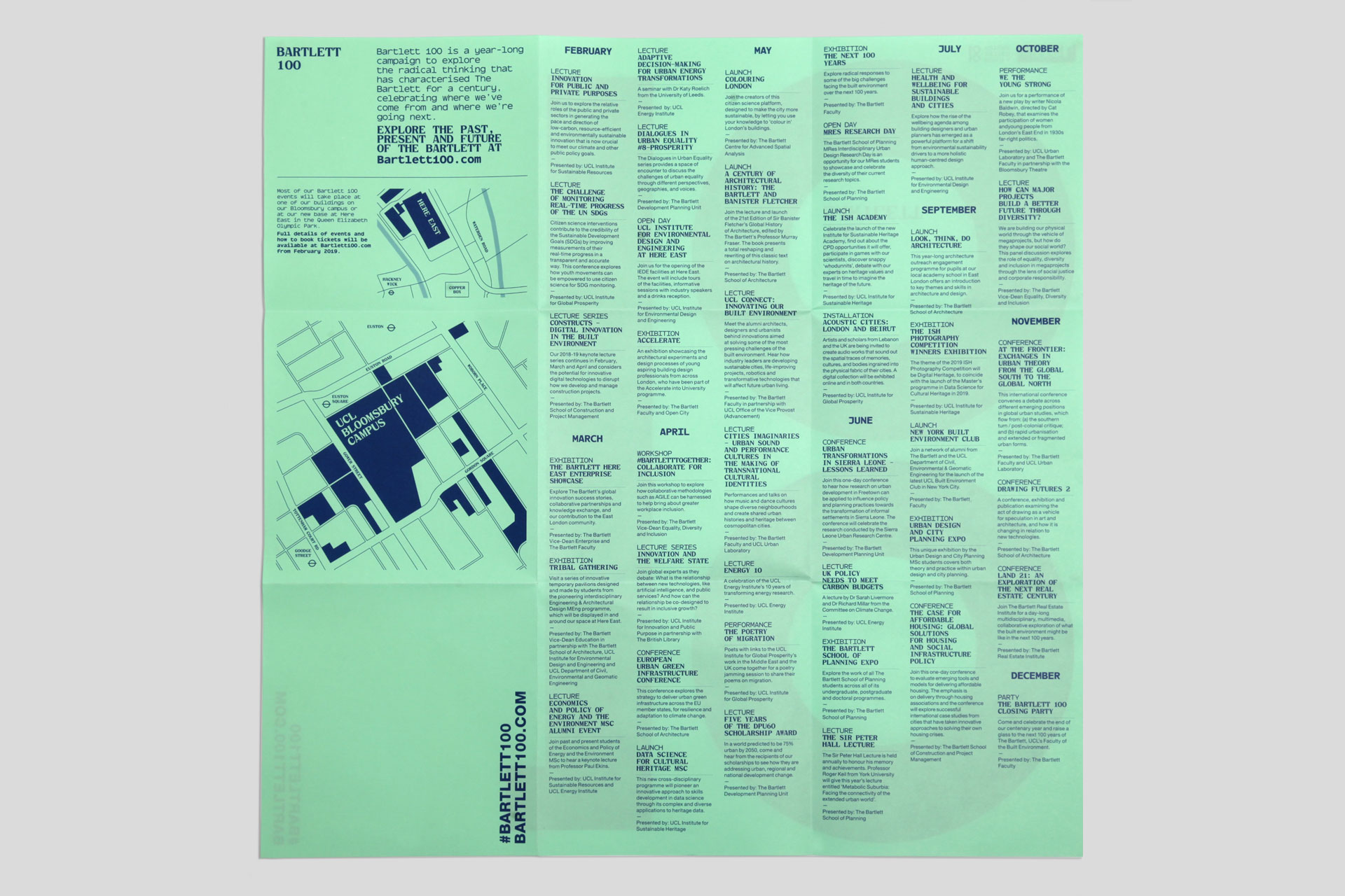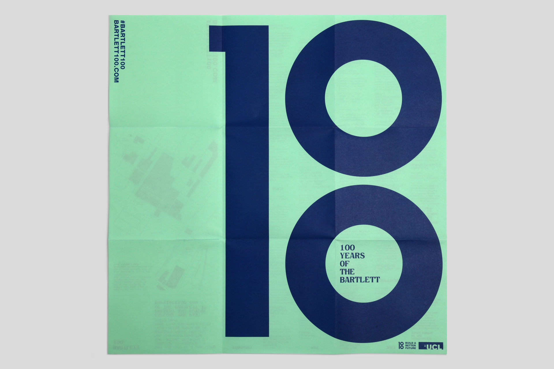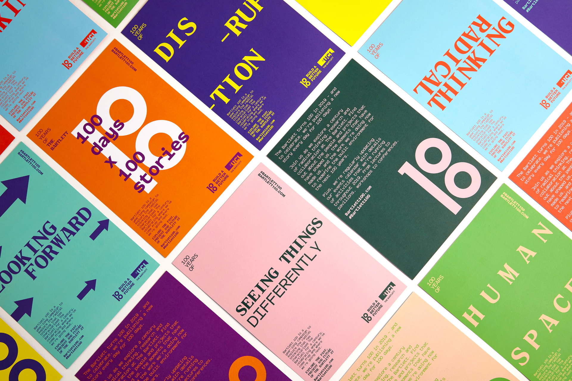 2019 marked 100 years of radical thinking, research and collaboration at The Bartlett (UCL’s Faculty of the Built Environment). To celebrate they ran a year-long campaign across 100 events, telling 100 stories in 100 days. We worked with the Faculty on all the launch material for the campaign. With compelling copy and words from Eggcorn, and a bespoke monospace typeface from Colophon Foundry, we developed a bold, type-led approach for this landmark year of celebrations.